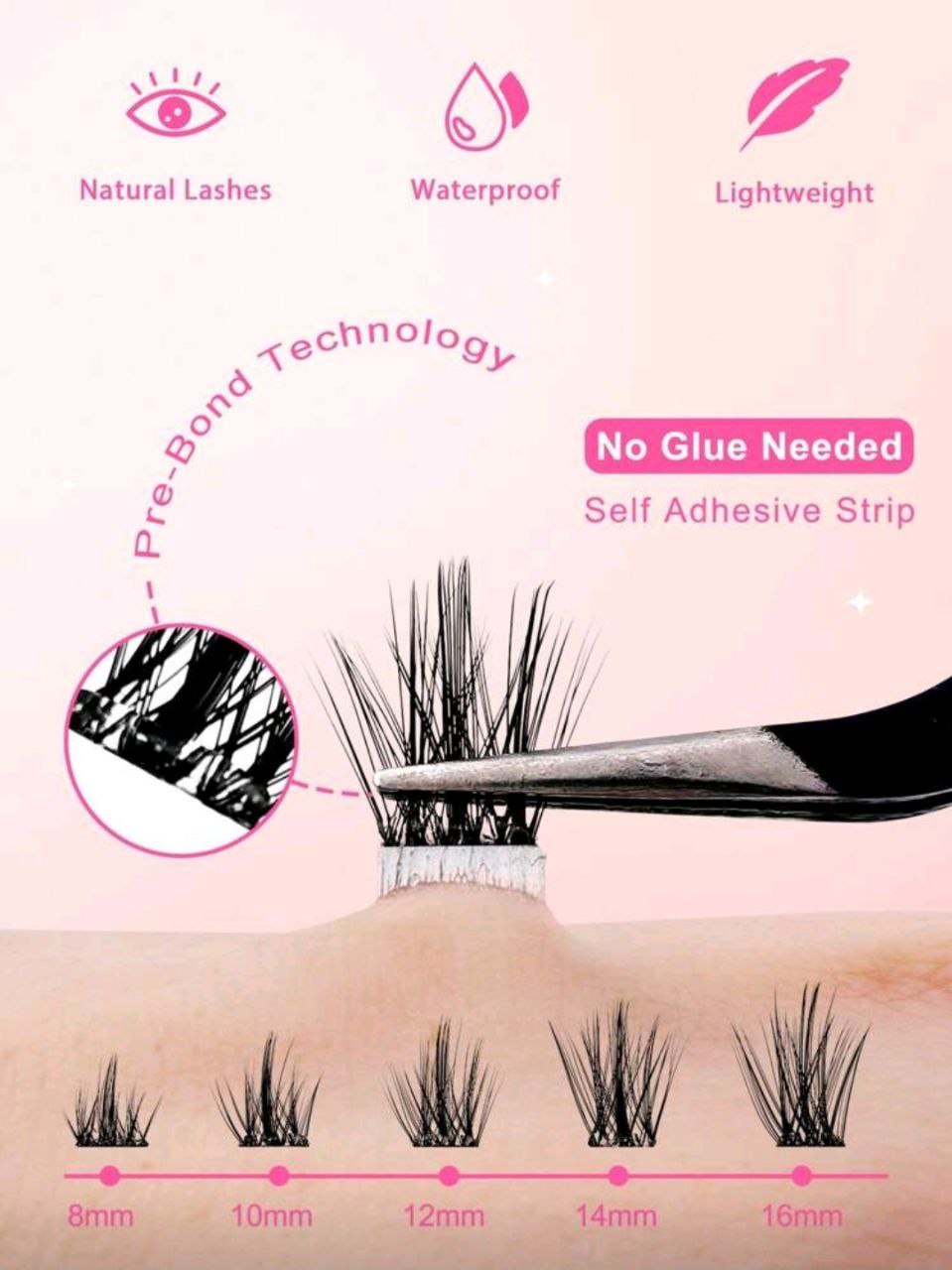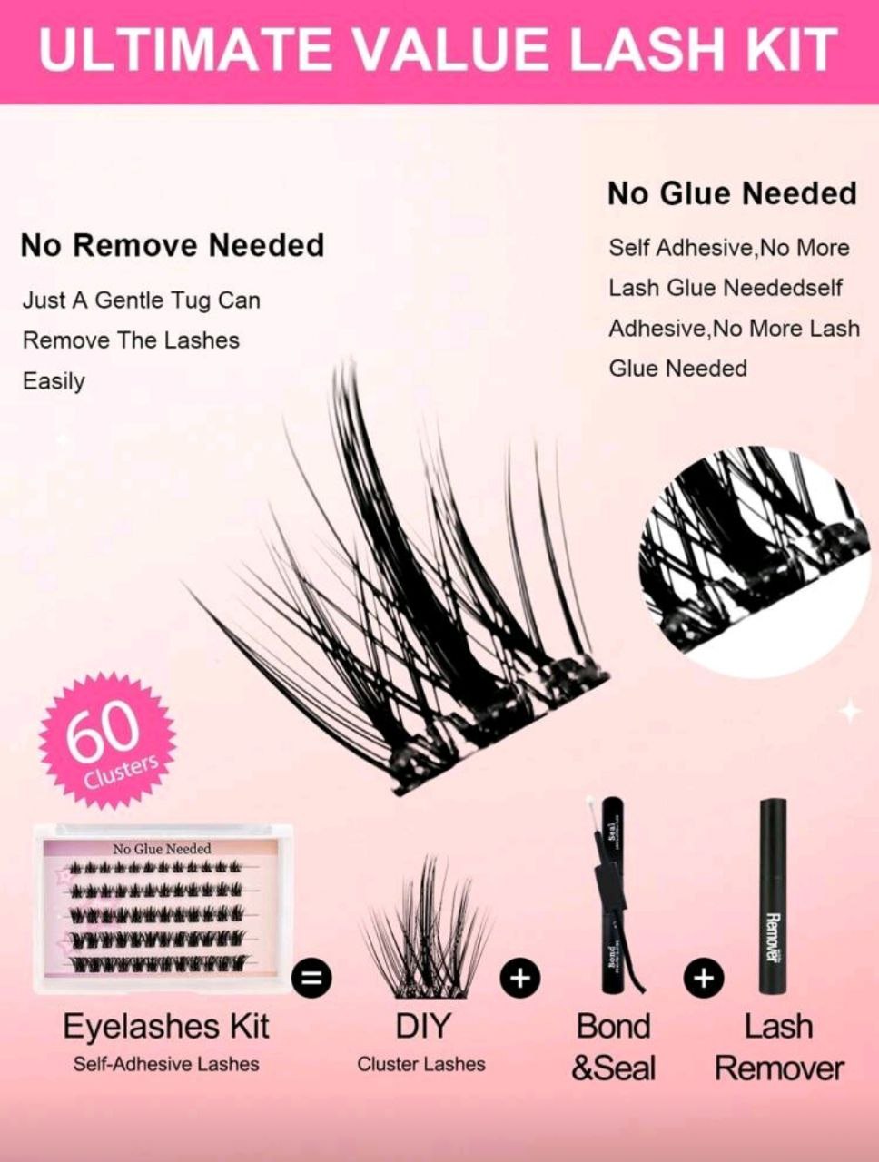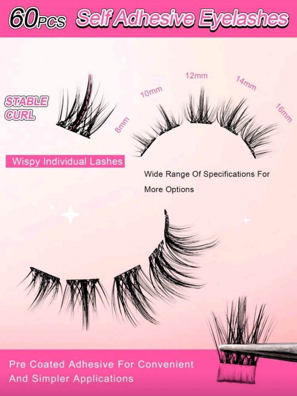 60Pcs C Curl Self Adhesive Individual Cluster Lashes Kit 8-16mm DIY Lash Extension Set With Tweezers And Lash Clurler Press On Segmented Lashes No Glue Needed